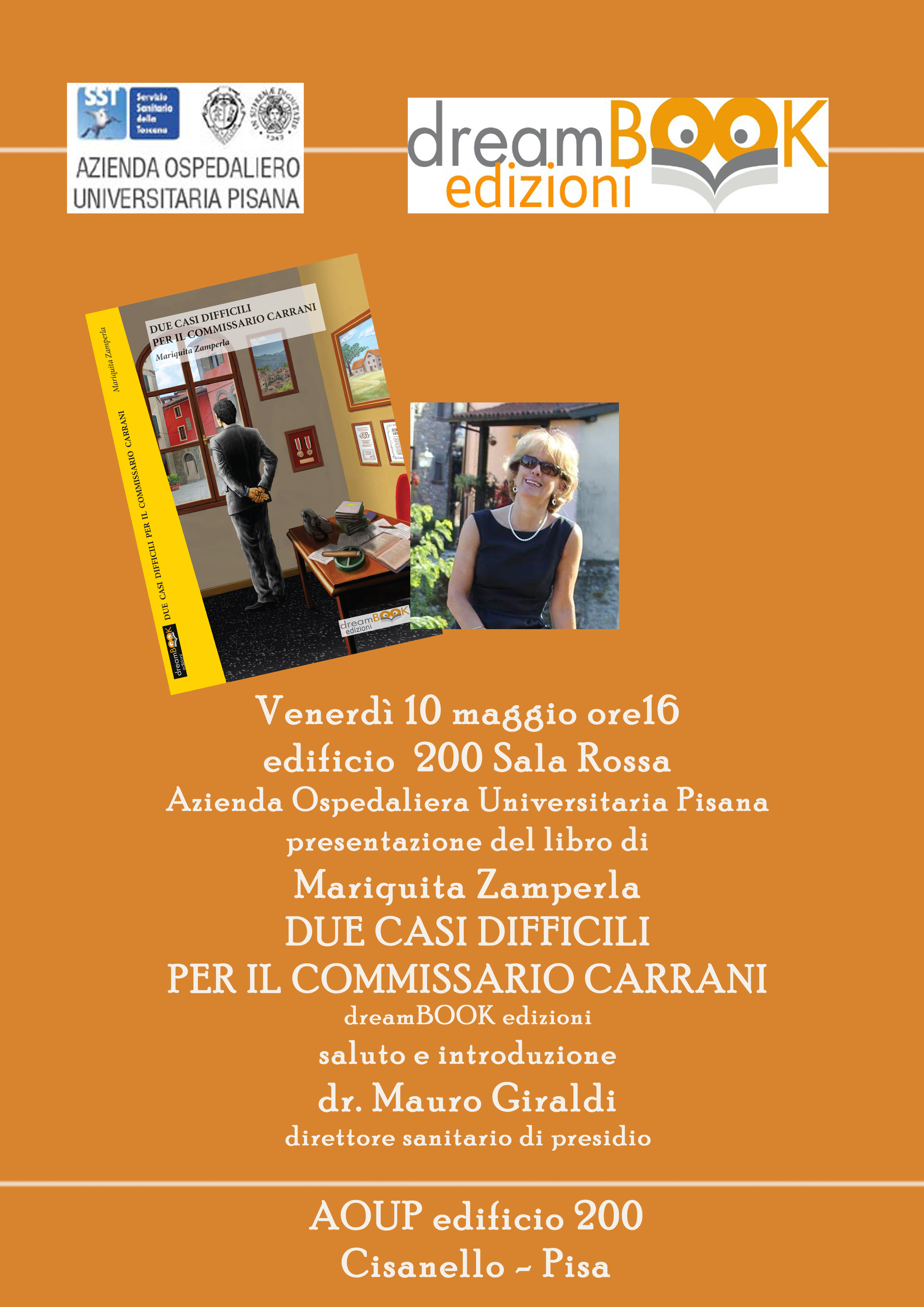 Nell’ambito delle iniziative culturali che si svolgono in Aoup e che prevedono già dei momenti musicali con i concerti organizzati dalla Sezione pisana dei Donatori di musica, il 10 maggio si presenta all'Edificio 200 a Cisanello (Aula Rossa, nr. 49, alle 16) il libro di Mariquita Zamperla – dipendente del Dipartimento di Area tecnica dell’Aoup nonché appassionata di scrittura – dal titolo “Due casi difficili per il commissario Carrani”, un giallo ambientato in Lucchesia.