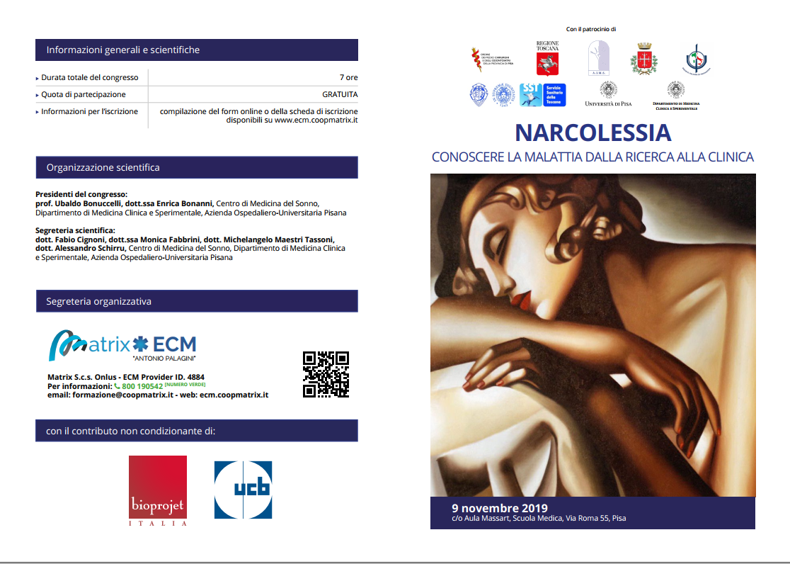 Sabato 9 novembre a Pisa, nell'Aula Massart della Scuola Medica (via Roma, 55 - inizio alle 8.30), si svolgerà il congresso dedicato alla narcolessia dal titolo “Conoscere la malattia, dalla ricerca alla clinica”.