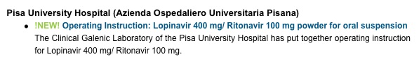 L'Unità operativa di Farmaceutica – Politiche del farmaco dell'Aoup ha realizzato, in collaborazione con Unipi, una formula galenica liquida (sospensione orale) dell'antivirale lopinavir/ritonavir a partire dalla forma solida del medicinale (in compresse), per ovviare alla temporanea mancanza del prodotto commerciale liquido (medicinale estero) durante le fasi di importazione.