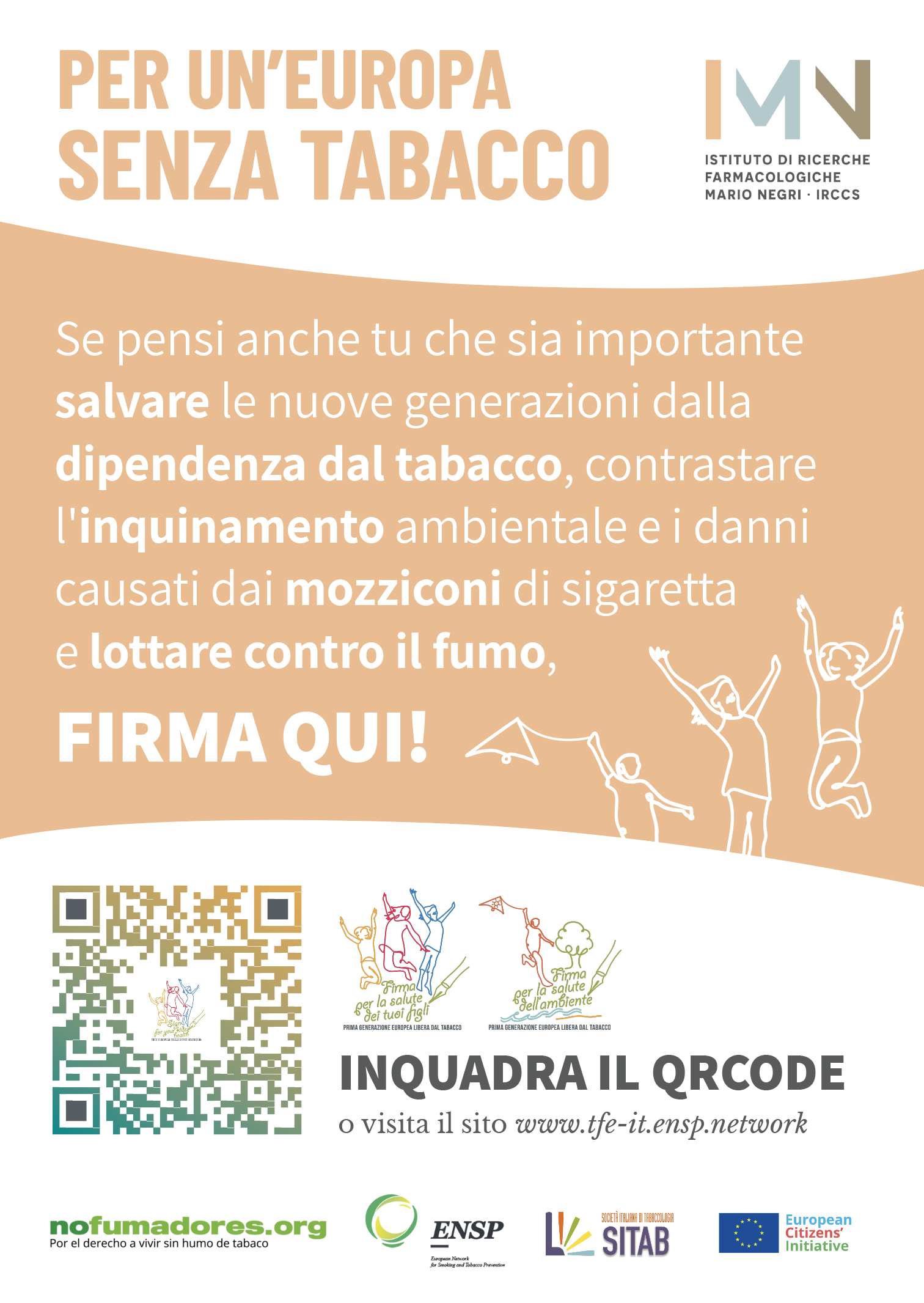 Si segnala inoltre l’iniziativa “Tobacco Free Europe” per ottenere la prima generazione europea libera dal tabacco entro il 2030 (stop vendita di prodotti con tabacco/nicotina per i nati dopo il 2010 e divieto di fumo anche all’esterno per tutelare l’ambiente da fumo e mozziconi). C’è tempo fino al 16 gennaio 2024 per raccogliere 1 milione di firme in tutta l’Unione Europea. Si può firmare qui: https://eci.ec.europa.eu/029/public/#/screen/home oppure, scaricando i volantini allegati, basta inquadrare il QR code per aprire la pagina e firmare l’appello.