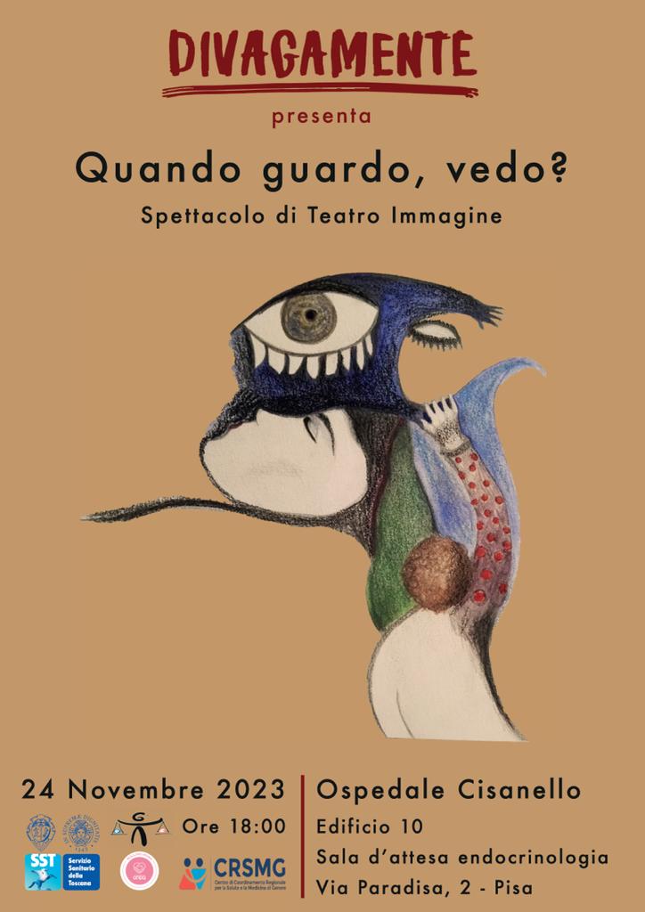 Il 24 novembre – Spettacolo teatrale dal titolo “Quando guardo, vedo?” (a cura della Compagnia Divagamente) sulla prevenzione e il riconoscimento della violenza di genere all’Ospedale di Cisanello, Edificio 10, piano terra – Area di attesa ambulatori percorso endocrinologico, dalle 18 alle 19.30. L’evento è realizzato secondo la tecnica del Teatro dell'Oppresso che prevede un'interazione diretta con il pubblico che, grazie a varie tecniche, da spettatore, diventa attore.