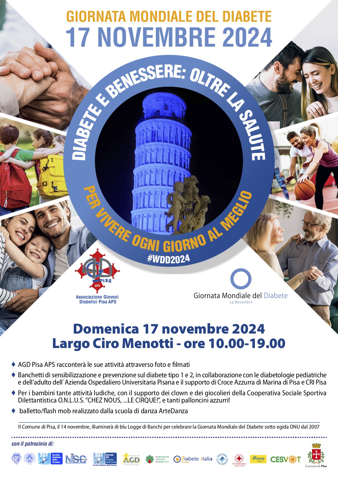 Dalle 10: due banchetti informativi; uno focalizzato sul diabete di tipo 1 nei bambini e ragazzi, gestito da Agd-Associazione giovani diabetici Pisa APS, e l’altro sul diabete di tipo 2, coordinato dall’Unità operativa di Malattie metaboliche e diabetologia dell'Azienda ospedaliero-universitaria pisana e il supporto della Croce azzurra di Marina di Pisa e della Croce rossa italiana di Pisa.