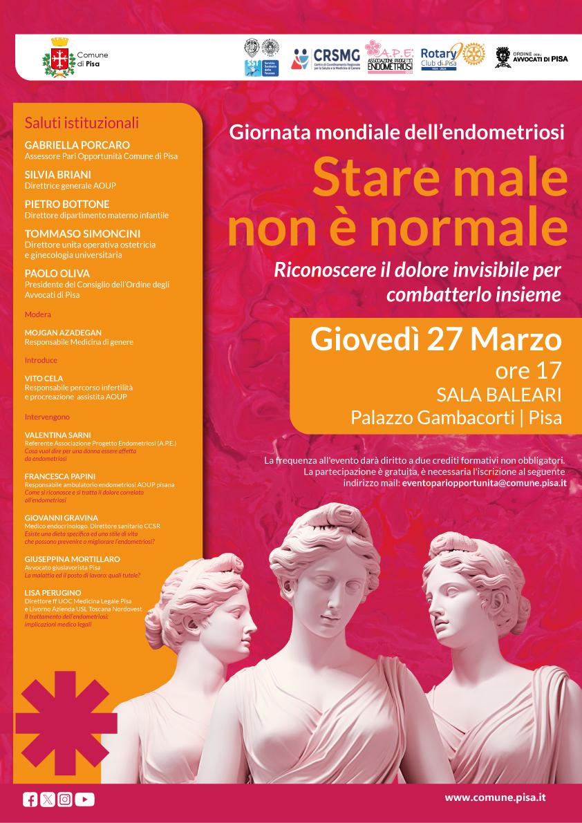 In occasione della Giornata mondiale dell'endometriosi, giovedì 27 marzo, alle 17, la Sala delle Baleari di Palazzo Gambacorti, a Pisa, ospiterà l'incontro: "Stare male non è normale: riconoscere il dolore invisibile per combatterlo insieme". Dopo i saluti istituzionali di Silvia Briani ‒ direttrice generale dell'Aoup ‒ e di Gabriella Porcaro ‒ assessora alle Pari opportunità del Comune di Pisa ‒ l'incontro sarà introdotto da Vito Cela ‒ responsabile della Procreazione medicalmente assistita in Aoup e della Rete regionale Pma ‒ e moderato da Mojgan Azadegan ‒ responsabile del Centro di coordinamento Salute e medicina di genere di Regione Toscana.