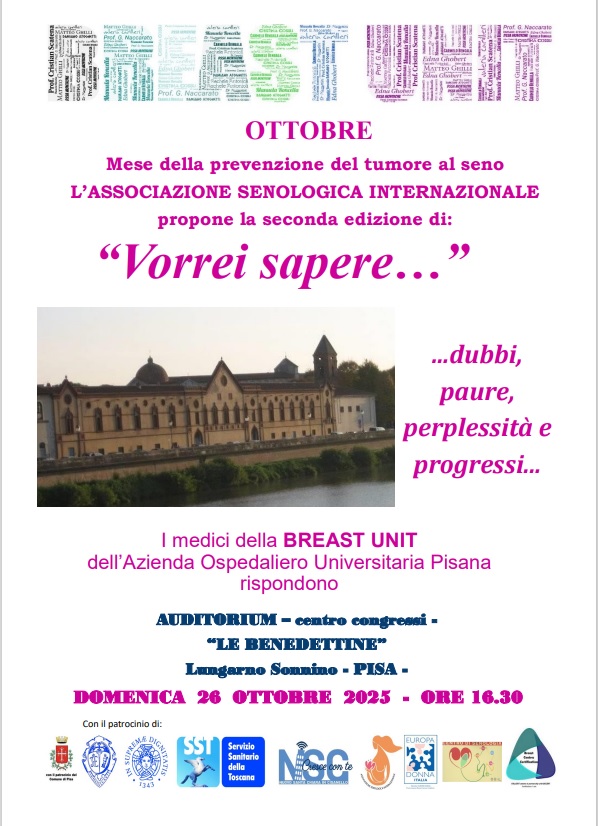 Domenica 26 settembre nel Centro congressi "Le Benedettine" (alle 16.30) si tiene l'incontro dal titolo: "Vorrei sapere... dubbi, paure, perplessità e progressi" con i medici della Breast Unit dell'Aoup. L'evento, promosso dall'Associazione senologica internazionale, rientra nelle iniziative organizzate in occasione del mese (ottobre) dedicato alla prevenzione del tumore al seno.