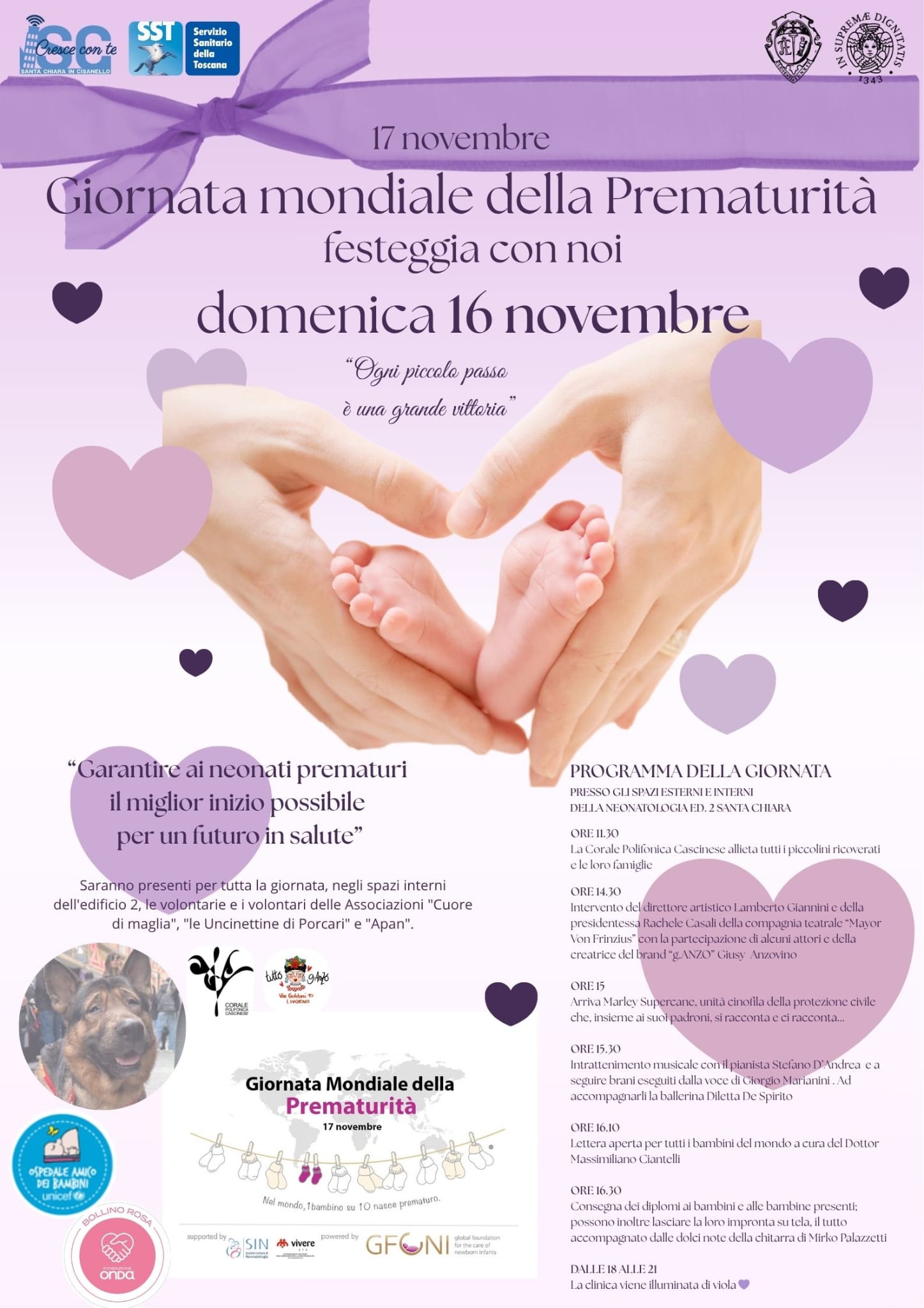 "Ogni piccolo passo è una grande vittoria": con questo motto si dipana la Giornata pisana della prematurità che prevede musica (esibizione della Corale Polifonica Cascinese), teatro, intrattenimento e solidarietà con un testimonial d'eccezione, Marley supercane, il pastore tedesco cieco dalla nascita addestrato al salvamento, beniamino dei più piccoli ma ormai mascotte per tanti reparti dell'Aoup. E poi ancora musica al pianoforte, esibizione canora, danza, oltre a un momento di raccoglimento con una lettera aperta a tutti i bambini del mondo a cura di un neonatologo spesso impegnato in missioni umanitarie, per finire con la consegna dei diplomi, accompagnata da musica, agli ex-pretermine presenti. Durante la giornata ci saranno anche numerose associazioni fra cui “Cuore di maglia”, “Le Uncinettine di Porcari” e l’Apan-associazione pisana amici del neonato.