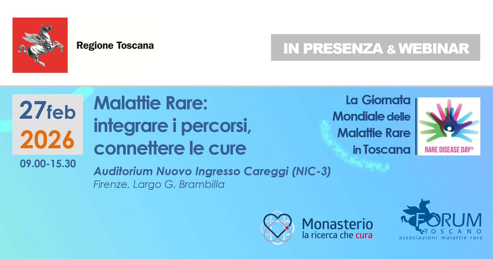 Il prossimo 27/02 si terrà a Firenze presso il Nuovo Ingresso Careggi (NIC-3), Largo Brambilla, l'edizione 2026 della Giornata mondiale delle malattie rare in Toscana dal titolo Malattie Rare: integrare i percorsi, connettere le cure coordinata a livello nazionale da UNIAMO - Federazione Italiana Malattie Rare. L'evento, è organizzato dalla Regione Toscana con il contributo del Comitato tecnico organizzativo per le malattie rare ed in collaborazione con il Registro Toscano delle Malattie Rare (RTMR). Per chi non potrà partecipare in presenza sarà possibile seguire i lavori in modalità webinar attraverso piattaforma dedicata. Di seguito il link per effettuare l'iscrizione (per ragioni organizzative da effettuare entro e non oltre il 25/02): form iscrizione giornata rare 2026