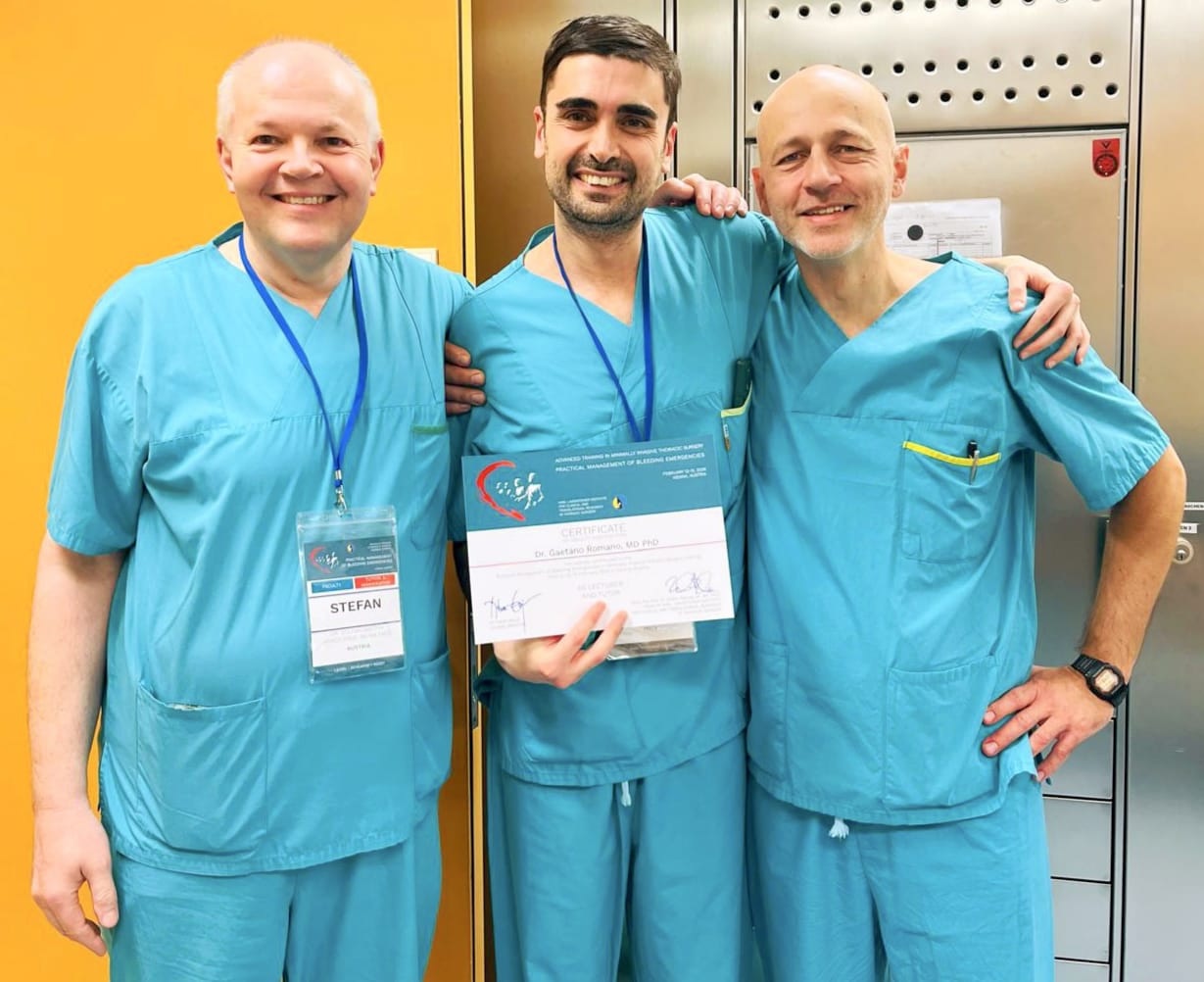 Del gruppo di esperti del corso, intitolato “Practical Management of Bleeding Emergencies”, oltre a Gaetano Romano facevano parte anche Tibor Krajc, chirurgo toracico a Vienna e presidente del corso, Stefan Watzka, direttore della Chirurgia toracica della Klinik Floridsdorf, Luca Bertolaccini, chirurgo toracico all’IEO di Milano, Oliver Ashur, anestesista, Bernhard Winkler, cardiochirurgo e Tim Graf-Kolvenbach, psicologo, tutti operanti a Vienna.